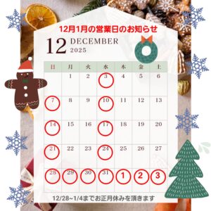 12月の営業日のお知らせ📢 投稿者 cleaningjabjab投稿日:2025年12月6日 12月は28日から長~いお休みを頂きます 年始は1/5からの営業になります お正月のお出掛けの衣装のクリーニングは お早めにお願い致します ご迷惑をおかけしますが よろしくお願い致します
